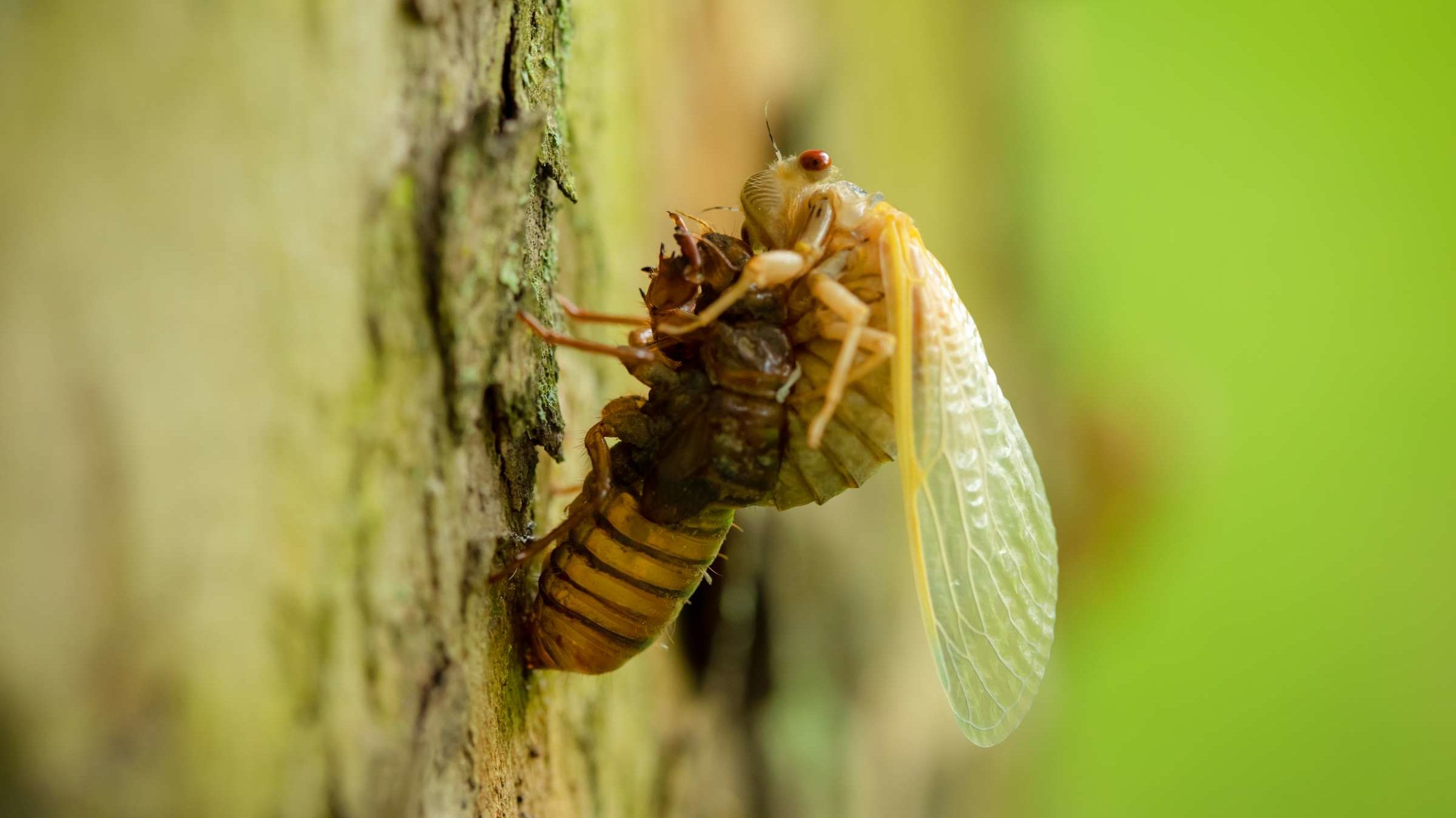 This time-lapse footage from the Associated Press shows the first moments of a 17-year cicada’s life above ground since its birth. After scaling the closest vertical surface it can find, the insect bursts from its nymphal skin and leaves it behind. Newly shed cicadas have pale bodies, but they quickly develop the familiar hard, black exoskeletons.