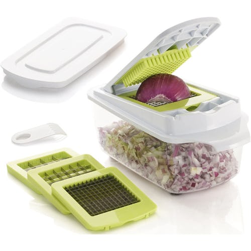 Place a peeled onion on this food chopper, then press down on the lid to dice it up into dozens of little pieces. Not only is it great for saving time in the kitchen, but each order also comes with three interchangeable blades (all of which are made from rust-resistant stainless steel) so that you have a choice in how small your diced pieces are.