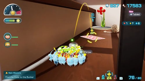 After you’ve gathered all three cards, make your way to the table across from the lift by using the fan below. You’ll then need to throw Pikmin at the dials to turn them to the right number. After you’ve matched each dial to their respective card, the safe will open, revealing the last major part of the game.