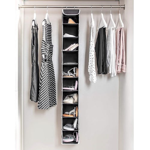 Shoe storage does not have to be hard. This 10-shelf hanging shoe organizer displays your shoes amid your wardrobe so you can pick a pair to go with your outfit when you pick your clothes. Each cubby holds one pair and there are side pockets for accessories like wallets, scarves, and sunglasses. It comes in four colors and has nearly 8,000 five-star reviews.