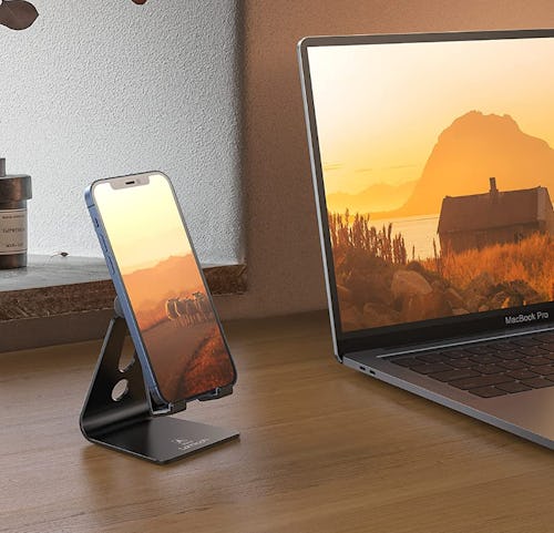Turn your phone into a usable screen while you work or sleep by setting it in this cell phone stand that holds it where you can glance at it. Instead of hunting down your phone and picking it up to see notifications, alarms, or timers, you can glance at it without moving. Made of a high-quality aluminum alloy, the stand is sturdy, adjustable, and light. It comes in nine colors.