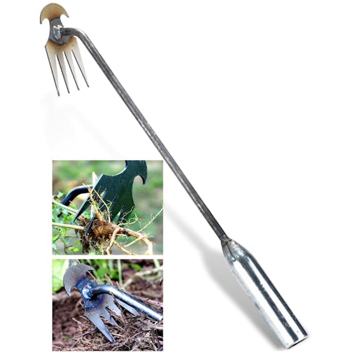 A weeding tool that reaches deep into soil to yank out roots