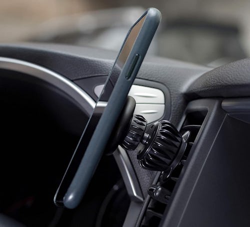 This phone mount has every possible feature you are looking for in a tool for holding your phone while you drive, or do anything, hands-free. A clip holds it to the vents and it sits on a ball bearing you can easily rotate. This magnetic phone mount comes with two metal plates you can stick to the backs of any phone so that it easily sticks to the mount. “I have not liked several other adapter devices for phone in the car but this one is perfect. You do have to attach a small flat disk to the back of your phone case in order for product to work. I had no problem doing this and the adhesive disk has remained in place since I put it in,” said one reviewer.