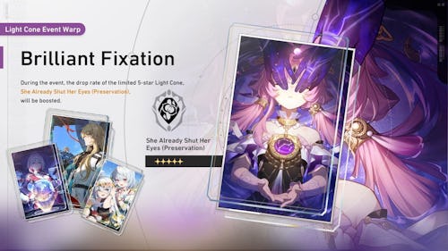 As a five-star character, Fu Xuan has a Signature Light Cone available on the Brilliant Fixation limited banner. “She Already Shut Her Eyes” has the benefit of adding unmatched buffs to Fu Xuan’s HP stat which boosts her healing potential and gives DMG buffs to the party. Another good five-star option is “Texture of Memories”