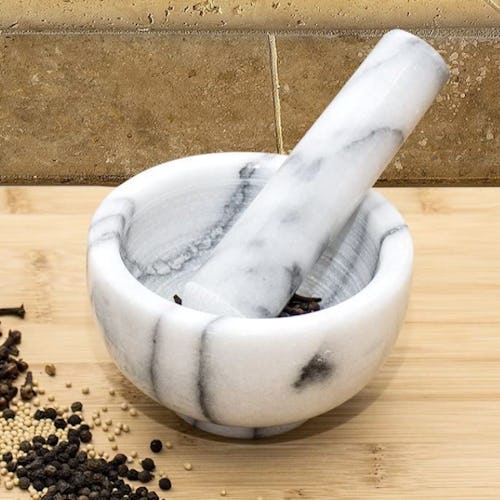 This mortar and pestle will be the chicest thing in your kitchen with its classic marble design. The simple bowl is perfectly glossy on the outside with an unpolished textured finish on the inside to make it easier to grind up spices. It’s also easy to wipe clean when you’re done using it.
