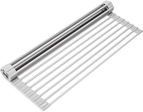 This over-the-sink dish drying rack has a 4.8-star overall rating after more than 33,000 reviews thanks to its versatility and quality. While it can be used to drip-dry dishes over the sink, its food-grade silicone coating makes it heat resistant to 400 degrees Fahrenheit, so it's also a useful (and large) trivet. It's available in four sizes in the listing.