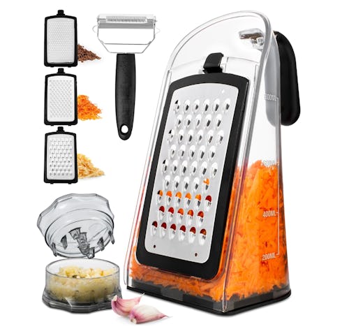 Keep your countertop clean with this thoughtfully designed cheese grater. With an attached storage container, it gathers all of your grated food in one place, making sure you don’t waste anything while prepping your dinner. It comes with three grating surfaces, a garlic crusher, and a vegetable peeler, making it easier than ever to add your favorite ingredients to meals.