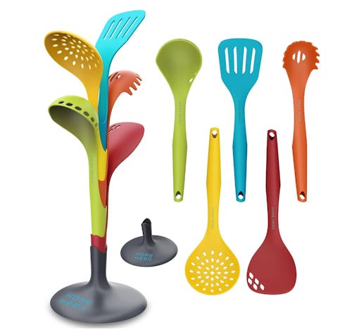 Never lose track of serving spoons or spatulas again with this kitchen utensil set. It contains five heat-resistant tools — a soup ladle, a pasta server, a slotted turner, a solid turner, and a skimmer — and a base to keep everything together. Store it on your kitchen counter for easy access any time you’re cooking.