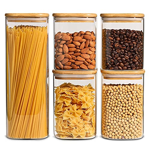 ComSaf Food Storage Containers with Airtight Bamboo Lids Set of 5, Clear Glass Canister Food Jar with Sealing Lid Kitchen Pantry Storage Container for Spaghetti Pasta Sugar Flour Cereal Beans, Square