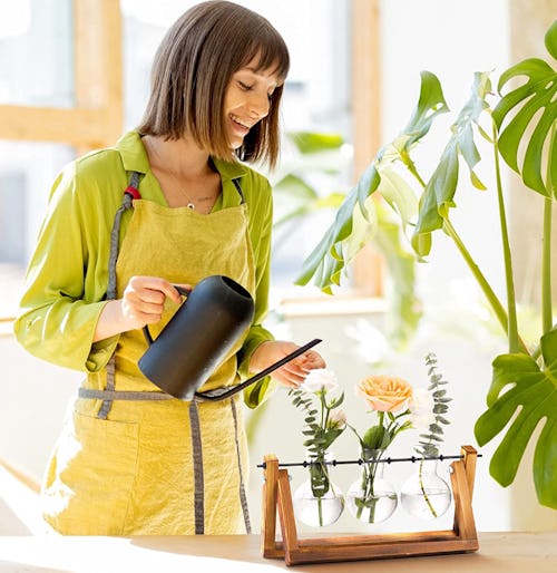Plant parents looking for a unique way to display their favorite buds and blooms should check out this vintage-style plant terrarium. The clear glass containers and wooden frame make this just as much a statement piece as a functional plant holder. Display it in your kitchen, office, or living room.