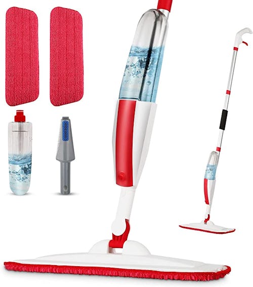 Cleaning the floors does not have to include a battle with a heavy bucket. You don’t even need to get out a cleaning spray. This spray mop keeps the cleaner ready and mounted on the handle in the integrated spray bottle. So all you have to do is pull the trigger and slide the microfiber mop over the mess. It comes with two mop heads so you always have a clean one handy.