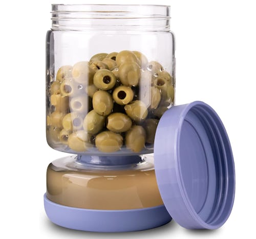 With two separate compartments, this pickle jar separates the liquid from the pickles when you want to pull them out without getting your hands wet. Then, flip it over and the pickles will soak in the brine again to stay fresh. The jar is made from thick borosilicate glass with an airtight lid. It’s useful for other foods as well, like olives, certain fruits, and more.