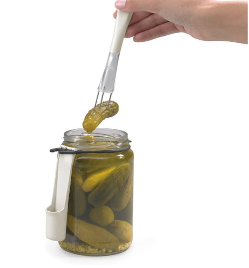 This handy little fork is specifically to get pickles, olives, or other pickled snacks out of the brine in the jar while also keeping your fingers clean. It has its own holder that stretches to fit around any jar — even if you grab the larger jar of pickles at the grocery store. This fork holder also prevents the brine and juice from dripping in the fridge.