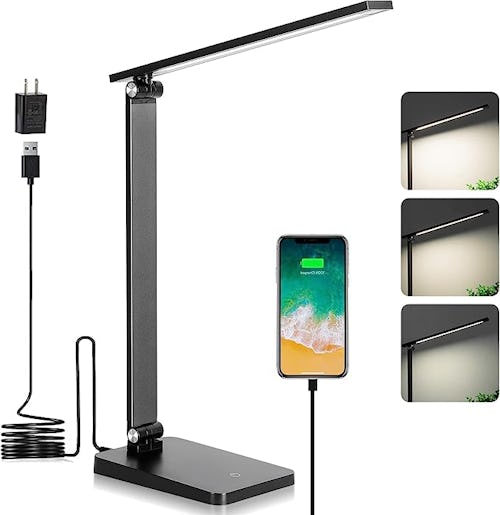 This desk lamp has a sleek LED light bar that’s easy to fold down when you’re not using it. The LED has three dimmer settings, and it’s completely free of blue light to keep your eyes extra happy at work. Meanwhile, the slim base has a USB port for your phone charger and a simple-to-use touch control button.