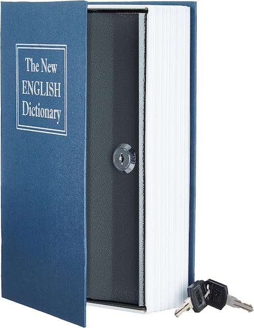 This sneaky book safe is super roomy because it’s disguised as an extra-thick dictionary. Simply lift the hardcover “dictionary” cover, and you’ll find a sturdy steel safe inside. It also comes with two keys, so you’ll always have a backup to open this nondescript book safe.
