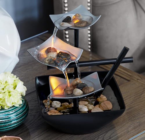 A soothing water fountain seems like an expensive decor piece, but only you’ll know that this aesthetic fountain is actually budget-friendly. The water will trickle down three silver trays until it ends up in a chic matte black bowl. It also comes with river rocks and a warm white light that makes it even more calming.