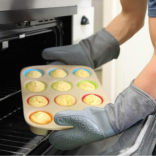 These oven mitts are cotton on the inside and up to your elbow, but the palm section is a silicone material, which adds much-needed grip and heat resistance. These stylish numbers can handle temperatures up to 450, and they’re water resistant so you can use them for boiled foods, too. With an extra-long design and a functional top, there’s no wondering why these have a 4.8-star rating on Amazon.