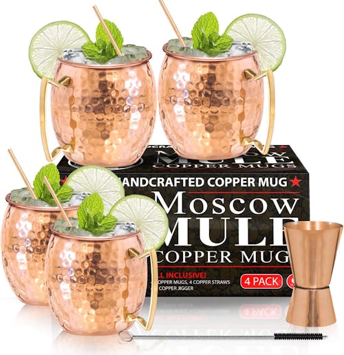 Whether you’re gifting for a host with the most or a cocktail enthusiast, these Moscow mule mugs are sure to please. Featuring a hammered copper exterior and sturdy welded handles, these glasses hold 16 ounces each, providing plenty of space for vodka and ginger beer. The set also comes with several bonus items, like copper straws and a measuring jigger.