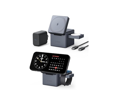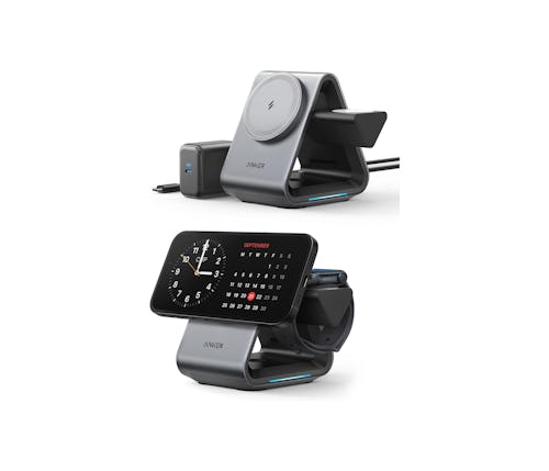With up to 15-watt fast-charging support, this gray and black 3-in-1 station houses an outstretched arm to lay an Apple Watch onto, while an AirPods case (with wireless charging support) would be tucked inside the triangle. The Anker 737 MagGo Charger includes a USB-C charger and a 5-foot (1.5-meter) USB-C to USB-C cable.