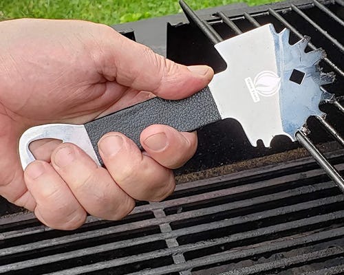 Clean your grill, smoker, and oven using this stainless steel scraper with notches that fit round and V-shaped grates. Unlike bristles, it cleans quickly and efficiently, removing stuck-on food with minimal effort. The scraper head also has a flat edge that can be used to clean a griddle and its opposite end happens to be a bottle opener for ultimate convenience.