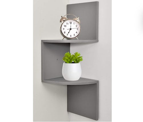 Utilize an empty corner and give it a practical and decorative function with this two-tier floating shelf. The unique corner design is perfect for a small space such as a bathroom, home office, or kitchen, and all necessary mounting hardware is provided to make installation a breeze. The shelf is available in three neutral colors to fit any style and is a total steal for under $20.