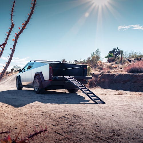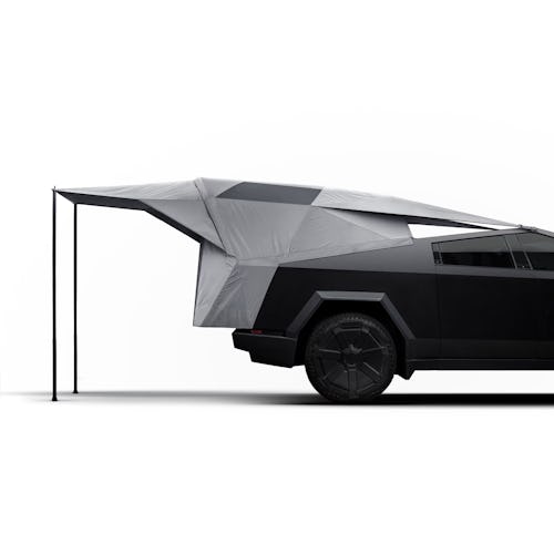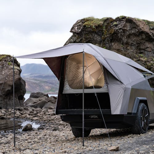 The Basecamp will set you back a cool $2,975. The “geodesic air-frame design” is made of weather-resistant nylon and includes the awning, awning poles, and an air pump that Tesla says can inflate the tent “in minutes.” The whole thing collapses down and “mounts above the truck bed, but below the tonneau cover.”