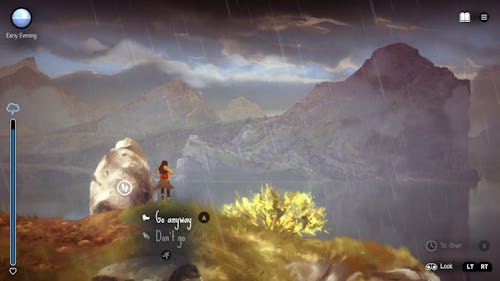 As Moira McKinnon, a teenager running away from home, players travel across a series of hills in the Scottish Highlands towards her uncle’s lighthouse. Her goal is to get to her destination within six days, in time for Beltane. A series of hills and mountains separate her from her goal. Just like in Skyrim, if you see a mountain, you can climb it.