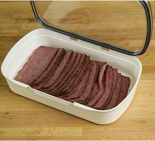 Deli meat has a tendency to get slimy fast, but this food storage container features raised ridges that keeps juices away. The transparent lid is compatible with dry-erase markers, so you can note expiration dates on top. The base is made of dishwasher-safe plastic, and the lid features a silicone seal to ensure freshness.