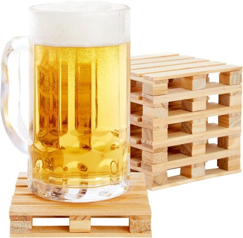 This set of six wooden coasters offers a rustic look and feel, as they are crafted to look like tiny pallets. They perfectly fit any standard-size mug, glass, or bottle, and they provide a nice lift as well, thanks to the height. Stack them up on your coffee table for a fun warehouse-inspired look.