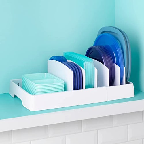 In kitchens all over the world, there is (probably) always someone frantically searching for the lid to a food storage container. This lid organizer makes that search quick, calm, and easy. It adjusts to fit whatever containers you have, holds them upright to save space and so you can see them all at once, and fits on a cabinet shelf.