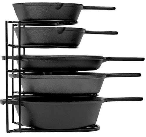 Reviewer: “I love my cast iron skillets but kept them stacked together and struggled to lift them. This holder gives them each their own shelf, and I can easily grab whichever one I want. It also keeps them separated, so they stay dry and rust-free.”