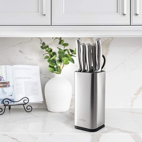 Store all your knives and scissors in this sleek and compact stainless steel knife block and it will save space on your counter and look good doing it. It holds up to 12 knives and a pair of scissors in the cleverly designed slots, yet claims only a 4-inch square footprint on your counter.