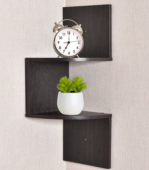 Turn any corner into a decorative display area by mounting this two-tier corner shelf into it and storing your collectibles or photos on it. It transforms what might have been clutter into art. And, since it takes advantage of underutilized corner space, it’s also a great way to add storage to a bathroom, kitchen, or small bedroom. It comes in three finishes and is super easy to mount.