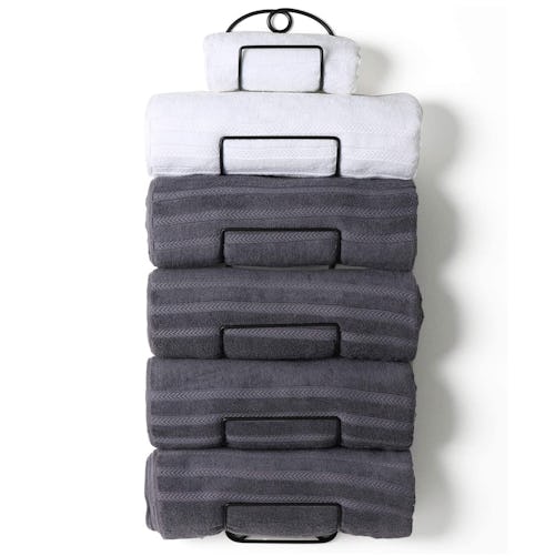 Keep your towels handy in the bathroom while turning them into a design element — just roll them up and put them in this wall-mounted towel rack. The two-piece design lets you hang them as one vertical rack or side-by-side for horizontal storage. There are five finishes and they work well for wine bottles, too.