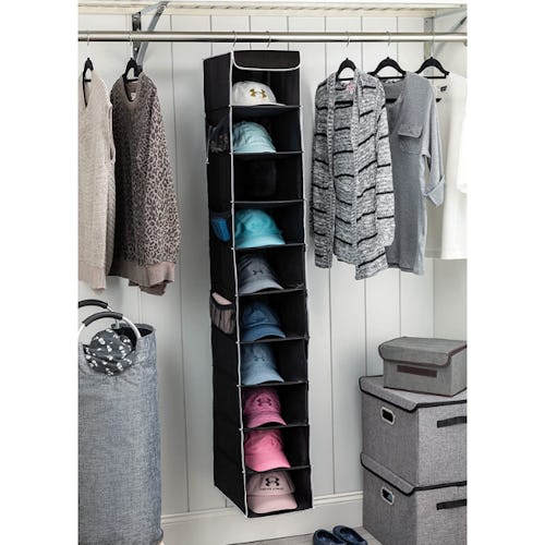If your hat collection has exceeded your storage capacity, hang this 10-shelf hat organizer in a closet and put them all away where they will be safe, easy to find, and clean. It hangs right over the closet rod and has lots of mesh pockets on the sides, too, so you can stash wallets or other small items in it.