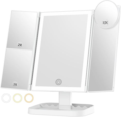Choose between 2x, 3x, and 10x magnification by using the various panels on this vanity mirror. You can also adjust the angle and lighting between cool, warm, and natural modes. It has a removable divider in the base that can be used to store essentials, and it folds closed when not in use. Power it via USB or batteries.