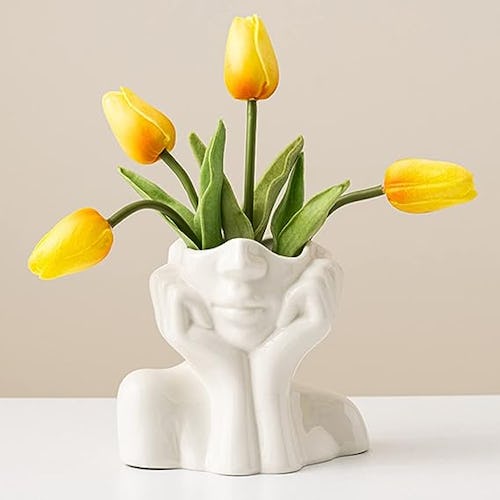 The beauty of this highly rated bust vase (other than its breathtaking design) is that it can be displayed with or without a bouquet inside. The piece is ceramic and handmade and it even comes in multiple versions in the listing, one of which is simply two hands.