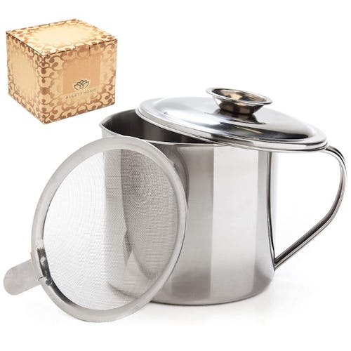 Pouring bacon grease down the sink can create a clog — and that stuff is like gold when you are making popcorn, frying chicken, or want a high-quality fat for frying. So why not store and reuse it? This bacon grease container is made for that. It strains out stray bacon pieces, has a lid so you can store the fat, and hold five cups.