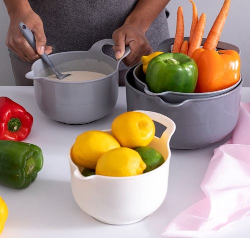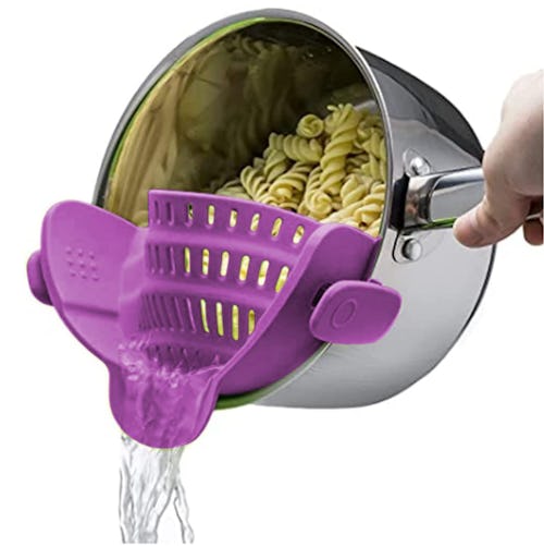 This snap-on pot strainer is such a genius cooking hack. Instead of clearing the sink, setting a big colander in there, and aiming hot water at the target, clip this colorful, silicone strainer right onto the pan and tip the water into the sink — right on top of whatever dirty dishes are in there. It stores easily, too, and comes in lots of bright colors.