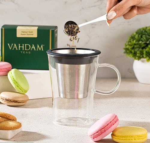 If you want to expand your tea option beyond easy-to-brew tea bags, this tea infuser mug is the ticket. The stainless steel infuser fits neatly into the cup. Just spoon some loose tea leaves in and pour hot water over it. Put the lid on to keep your brew hot while it steeps. Then use the lid as a drip tray for the infuser while you sip.