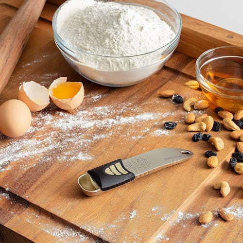 Tired of looking for the right size measuring spoon on a big ring of them? This adjustable tablespoon has all the sizes in one. Just slide the plastic divider to the right measure — printed on the handle — and fill the spoon. It can handle wet or dry ingredients with ease.