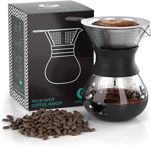 When you need a cup of great coffee and you need it now, this pour-over coffee maker will deliver. The laser-cut, stainless steel mesh filter is always there so you never run out of filters. The cool touch collar makes it easy to handle. And the borosilicate glass carafe is the right shape for brewing and pouring. All you need is hot water and ground coffee to make up to two cups of terrific pour-over anywhere.