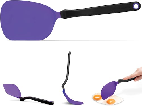 With a bendable neck and a wide, scratch-free head, this silicone chopping spatula is just the tool to pull out when you want to flip, chop, or scrape. The flexible, non-stick material slides over every curve, and since the bent handle keeps the end off your counter, you won’t need a spoon rest.