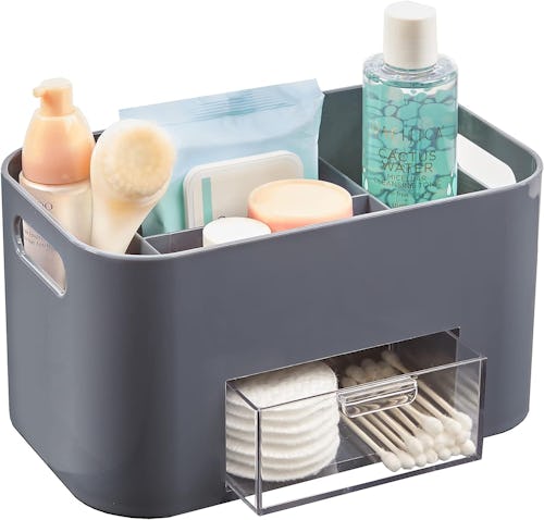 You’ll be able to fit a ton of toiletries or cleaning supplies within the four compartments and pull-out drawer in this bathroom organizer. Use the built-in handles to take it to and from other rooms in your home. “Love that I can fill the bottom tray with an assortment of cotton balls, Q-tips, and round cotton pads. Fits nicely next to my sink while in use, and I love that I can pick it up as one unit and move it into the cabinet when guests come over,” wrote one reviewer. It’s also available in white and clear in the listing.