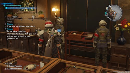 A pair of soldiers can be found in the item and accessory shop, Cecilia’s of Junon.
