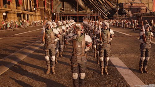 This one is also in the Main Street - City Center. You’ll see a group of soldiers taking pictures with a cardboard cutout of Rufus Shinra. Talk to them, take their picture, and they’ll join you.