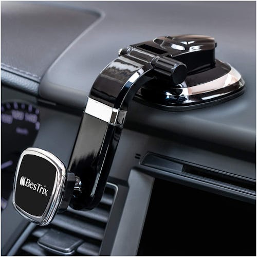 This car phone holder is made with an ultra strong suction cup that will sit securely on your dashboard as you drive. The other end has a magnetic surface that will snap onto any compatible phone, giving you the liberty of adjusting it to any angle (it fully rotates).