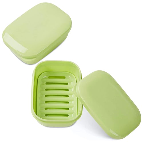 This soap container can preserve the bar you’ve been using and make sure that it dries after each use because of its raised and slotted base. A tight lid keeps any drops from escaping. The set comes with two containers.