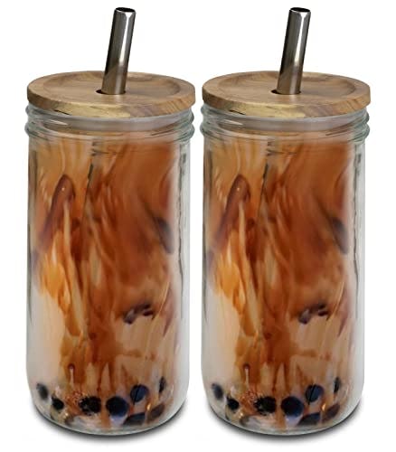 brimley 20oz Glass Boba Bubble Tea Cup with Acacia Lid, 2 Pack - Reusable Smoothie Cups/Glass Coffee Cups with Lids and Straw - Wide Mouth Glass Tumbler with 2 Sizes of Stainless Steel Straws