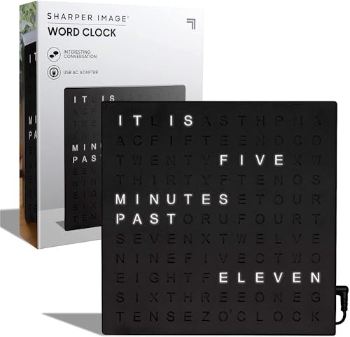 The contemporary design of this light-up word clock, inspired by a word search puzzle, offers a unique and modern approach to displaying time. With its striking black finish and compact size, this clock is a stylish timepiece for any room. Simple to set up and operate with a USB cable and intuitive controls, it makes checking the time more interesting.